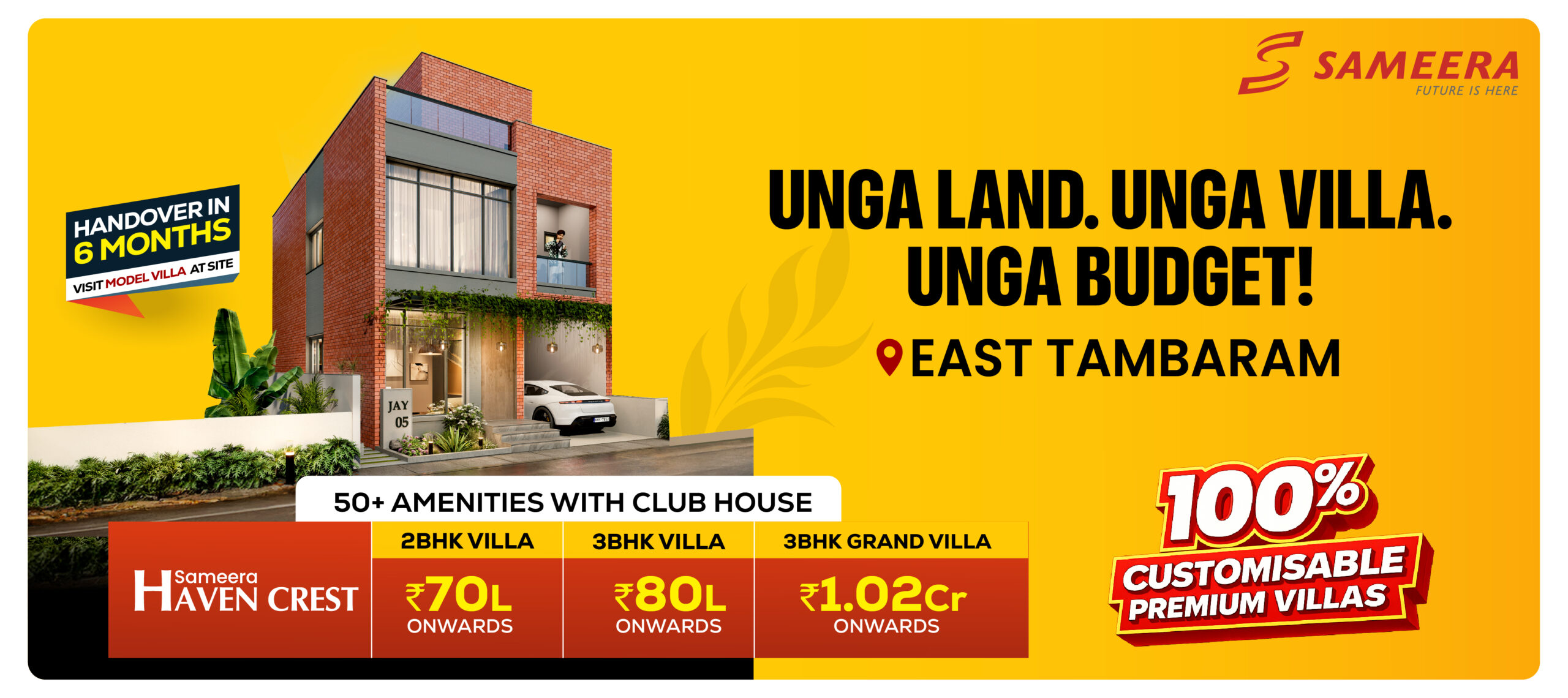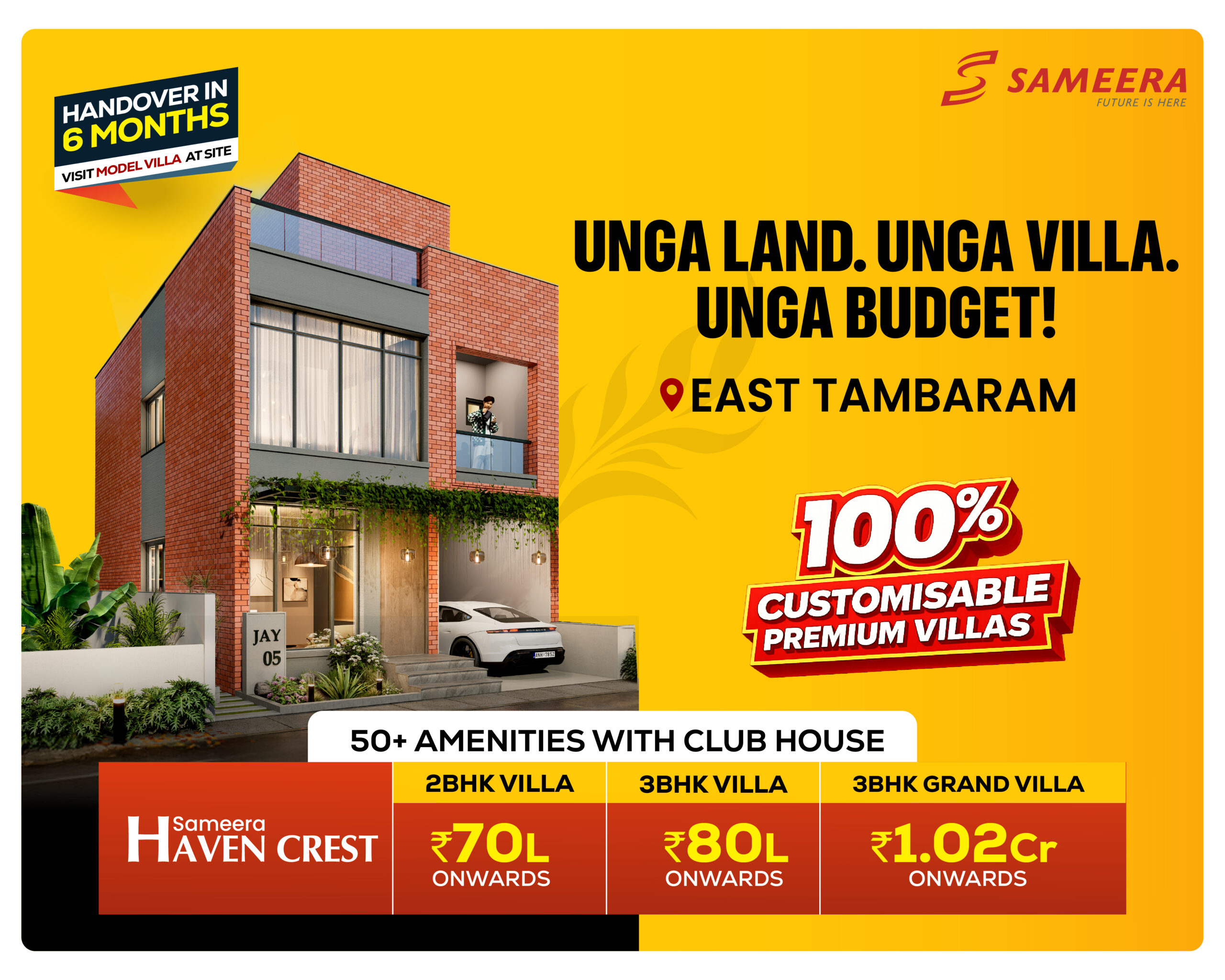 Sameera Haven Crest offers a thoughtfully curated collection of 2BHK Villas, 3BHK Villas, 3BHK Grand Villas, and exclusive 3BHK Bungalow Villas, inspired by elegant British-style architecture and spread across 7.27 acres in South Chennai. Each villa is custom-designed to suit different lifestyle needs, with spacious layouts, private outdoor spaces, and refined detailing.
